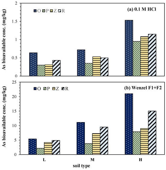 We analyzed the changes in bioavailable arsenic concentrations in rhizosphere soils before and after the planting of three plants. The results of the 0.1 N hydrochloric acid extraction method and F1 and F2 of the Wenzel sequential extraction method are shown in Figure 5. Before planting, the average concentration of bioavailable arsenic in the low-concentration soil was 0.64 mg/kg. After planting, the bioavailable arsenic concentration in the rhizosphere soil of Pteris vittata L. was reduced by about 53%; that of maize was reduced by 52% and a 33% reduction was observed by planting Rotala rotundifolia. The average concentration of bioavailable arsenic in medium-concentration soil before planting was 0.72 mg/kg. The concentration decreased by 51% after planting Pteris vittata L., 26% after planting corn, and 31% after planting Rotala rotundifolia. The average concentration of bioavailable arsenic in high-concentration soil before planting was 1.53 mg/kg. The average concentration decreased by 38% after planting Pteris vittata L.; 29% after planting corn; and 25% after planting Rotala rotundifolia. The bioavailable arsenic concentration decreased the most after the planting of Pteris vittata L., and the higher the soil arsenic concentration, the lower the reduction rate.