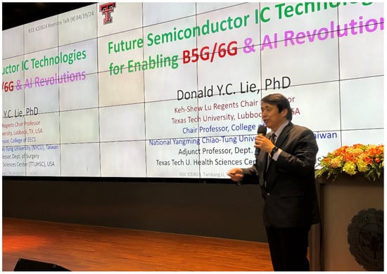 Figure 3 shows the second keynote speech entitled “Future Semiconductor IC Technologies for Enabling B5G/6G and AI Revolutions” presented by Chair Professor Donald Y.C. Lie, an IEEE fellow from the Department of Electrical and Computer Engineering, Texas Tech University, United States. He briefly introduced how fifth-generation (5G) mobile network technologies promise to deliver 10 Gbps peak data rates for 5G eMBB (enhanced Mobile Broadband) applications, sub-1ms latency and ultra-reliability for 5G mMTC (ultra-reliable machine type communication), and massive network capacity with increased availability to enable IoE (Internet-of-Everything) with x100 more wireless connected devices compared to 4G for 5G mMTC (massive machine type communication). To accomplish these challenging goals, it is imperative to move up from the sub-6 GHz 5G FR1 band to the higher-frequency bands, which has propelled massive R&D efforts and commercial investments into research on the millimeter-wave (mm-Wave) 5G FR2 band and product developments (i.e., mostly from 24.25 to 52.6 GHz). However, the design requirements of mm-Wave 5G hardware are considerably tougher and consume a bit more power compared to their sub-6 GHz 5G counterparts, especially challenging regarding their power-added efficiency (PAE), linearity, bandwidth, and cost. For the next-generation 6G that utilizes Terahertz (THz) communication (e.g., using D-band), its hardware design specs are expected to be even more challenging, putting a tremendous amount of pressure on IC (integrated circuit) semiconductor device technologists, as well as on the RF/mm Wave hardware IC design and system design communities. The performance and cost of RF hardware will become even more challenging and differentiating as the industry evolves into the AI (artificial intelligence)-centric 6G technologies.