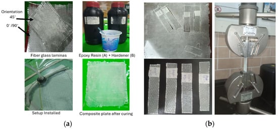 Three identical 22 × 22 cm glass fiber sheets are cut and positioned either at 0°, 90°, 0° or at 0°, 45°, 90° orientations within a mold on the glass slab. Fabric sheets and mesh are layered on top, with distribution pipes placed along the inlet and outlet sides. Sealing tape is applied around the perimeter, leaving a small gap, and the setup is covered with a plastic sheet and sealed under pressure. A vacuum pump is connected to the outlet side to form a vacuum, and resin is introduced into one end of the flow pipe while directing the other end to the sheet inlet. After allowing time for thorough resin coating, both ends are sealed, and the setup is left to cure in vacuum for 24 h. Finally, the plastic sheet is removed, and the setup is detached from the glass slab. The epoxy is mixed with hardener as per the ratio instructed by manufacturer as well as suggested by literature [21], resulting in 37.5 g of epoxy and 18.5 g of hardener. The setup overview been presented in Figure 2.