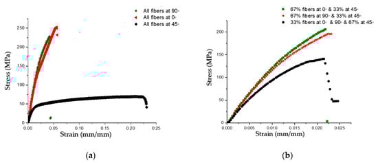 Figure 3b presents the stress–strain curves for Laminate 2 where two plies were oriented at 0° and 90° while one ply was oriented with a 45° angle. Samples were cut at 0°, 45°, and 90° angles.