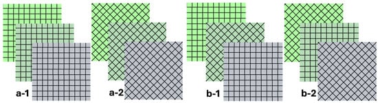 Schematic illustration of the fiber glass laminate orientations, i.e., (a) Laminate 1 with a-1, all laminates at 0°/90°; a-2, all laminates at 45°, (b) Laminate 2 with b-1, 2 laminates at 0°/90° and 1 laminate at 45°; b-2, 2 laminates at 45° and 1 laminate at 0°/90°.