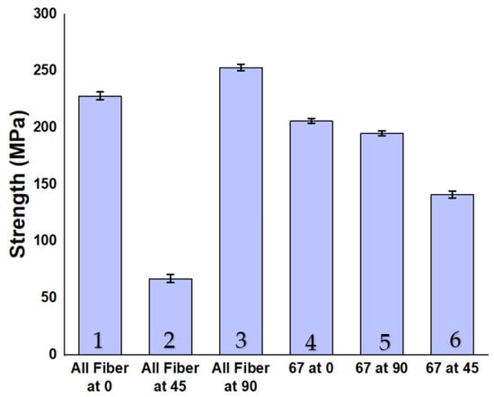 The experiments were repeated three times, showing minor variations with a maximum uncertainty of 3.6 in the results. The tensile strength of the composites was measured for different fiber orientations: all fibers were oriented at 0°, 45°, and 90°, as well as in combinations of 67% at 0° with 33% at 45°, 67% at 90° with 33% at 45°, and 67% at 45° with 33% at 0°/90°. The mean tensile strength values and their respective standard deviations and uncertainties are presented numerically in Table 2 and graphically in Figure 5.