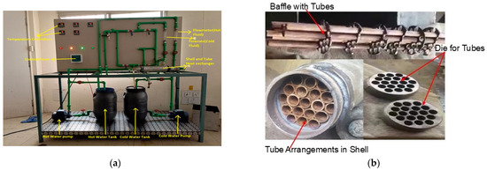 For the experimentation process, the hot fluid (nanofluid) was passed through the tubes, and cold fluid was passed through the shell and tube H.X; the range of the flow rate was 6, 8, and 10 L per minute which was measured with the help of rotameters. The heat exchanger was configured in a counter flow arrangement. The specifications of various components of the shell and tube H.X test apparatus are given in Table 1. The diagram of shell and tube H.X apparatus and tube arraignments with baffles are shown in Figure 1a,b.