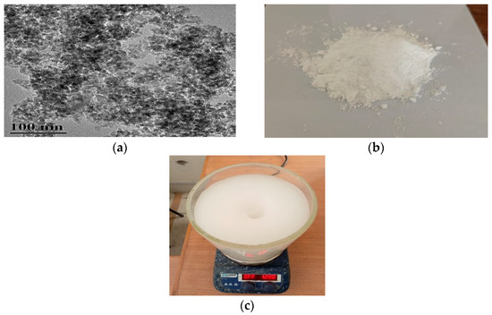 Al2O3-γ nanoparticles with a diameter of 10–15 nm were used for the preparation of the nanofluid. The nanoparticles were purchased from the Jiangsu XFNANO Materials Tech Co., Ltd. (Nanjing, China). The base fluid utilized in this process was distilled water. Utilizing a magnetic stirrer, the nanoparticles were constantly stirred for 90 min to evenly distribute them throughout the base fluid, and then these nanoparticles were sonicated using a stalwart sonicator. An exact volume concentration of 14 L of nanofluid was prepared for this investigation, and the particle weight was measured using a TS2000 weight scale, (Jiangyin Suofei Electronic Technology Co., Ltd., Jiangyin, China). In this work, Al2O3-γ nanoparticles at volume concentrations of 0.11, 0.22%, and 0.34% were used. An SEM image of the Al2O3-γ nanoparticles and the magnetic stirrer used for dispersion of nanoparticles are presented in Figure 2a–c. The thermophysical properties of nanoparticles are given in Table 2.