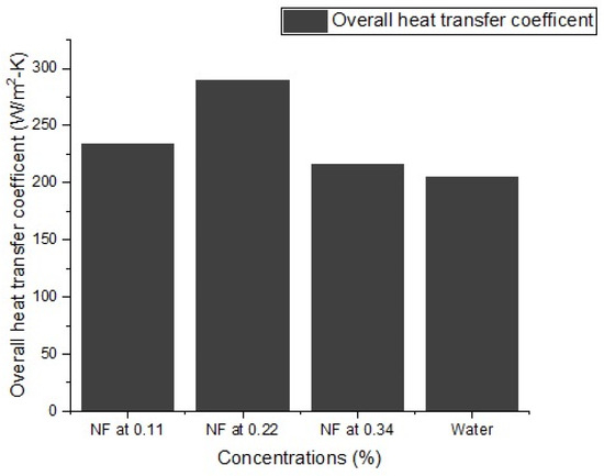 The thermal behavior of water and water-based nanofluids at various concentrations and flow rates was investigated. The findings showed that a higher k of the alumina oxide nanoparticles led to increases in the K of 26%, 44%, and 58% at nanoparticle concentrations of 0.11%, 0.22%, and 0.34%, respectively. The higher density of the nanoparticles added mass without significantly changing volume, and this increased the viscosity by 16%, 33%, and 44% at the same concentrations. The increased K of nanofluids requires less heat energy for a given temperature, and this resulted in a decrement of heat capacity of 24%, 67%, and 107%. The relation of U and concentrations is shown in Figure 3.