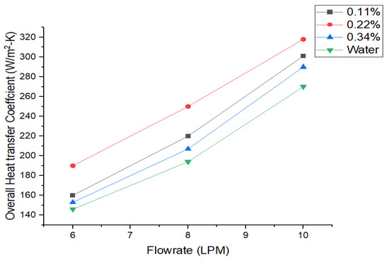 There were similar trends in the heat transfer rate as heat transmission increased by around 16% and 30%, respectively, at the 0.11% and 0.22% nanofluid concentrations as compared to water. At a 0.22% concentration, the nanoparticles were most uniformly dispersed throughout the base fluid, providing the highest surface area for heat transmission. The nanofluid’s stability was probably at its peak around 0.22%, which maintains the fluid’s consistent thermal characteristics and inhibits particle settling. Improved k results from this optimum dispersion also improved the interaction between the fluid and the nanoparticles. For experimental (U) and theoretical (h) values, the deviation of the volumetric concentration of 0.22% and water was noted as 38.81% and 22%, respectively. Alumina oxide nanoparticle addition resulted in improved heat transfer performance, as seen by the rising trends in both U and h with the nanofluid concentration. The relationship between the U and the flow rate at various concentrations and water is seen in Figure 5.