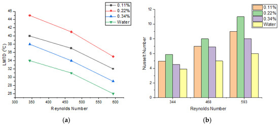 Figure 5 illustrates the effect of the alumina oxide nanoparticles’ volume percentage and the flow rate on the total h. It shows a notable improvement in the h between a 6 and 10 L/min flow rate; for 6 L/min, there was a 14.2% increase at 0.11%, a 33.57% increase at 0.22%, and at 0.34% the increase was only 5.7%. Similarly, at 8 L/min and 0.11% the increase was 19%, at 0.22 the increase was 36%, at a 10 L/min flow rate the increase was 14.2% at 0.11,% and at 0.22% it was 23.8%. When compared to water, the Al2O3–H2O nanofluid demonstrated about a 33% increase in U at the best concentration of 0.22%. The improved performance is attributed to the nanofluid’s higher thermophysical properties compared to water, and also the high conductivity and stability of the fluid. The relation between the LMTD and the Reynold number at various volumes and water is shown in Figure 6a.