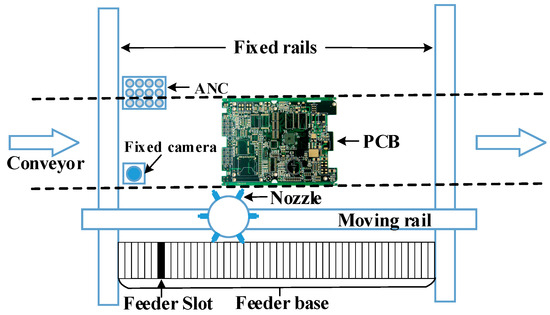 Once the PCB is positioned, the pick-and-place (PAP) process begins [9]. The schematic diagram of the spin-head surface mounter studied in this paper is shown in Figure 1. The spindle is equipped with six vacuum nozzles, which can be replaced via an automatic nozzle changer (ANC). The spin-head picks components from the feeder, moves them to the camera, and then places them on the PCB, repeating this process until all the components are placed. Feeders are supplied by feeder slots, and components can only be picked and placed by the corresponding type of nozzle.