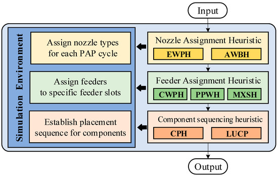 The SHH algorithm is designed to optimize the operations of a single spin-head gantry type surface mounter through the following structured, three-stage process: nozzle assignment heuristic, feeder assignment heuristic, and component sequencing heuristic. Within the FlexSim simulation environment, various heuristic combinations are rigorously tested until all the combinations have been evaluated, leading to the identification of the optimal solution. The detailed flow of the algorithm is illustrated in Figure 2. The comprehensive SHH algorithm operates as follows: