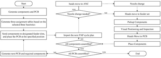 Components are dispatched to their designated feeder slots according to the feeder assignment table, and a PCB is sent to the conveyor belt at specified positions. For each PAP cycle, the system evaluates the need for nozzle changes based on the nozzle assignment table. If nozzle changes are required, the head moves to the automatic nozzle changer (ANC) to replace the necessary nozzles, with the time calculated based on the number of nozzles changed. Following this, the head retrieves components from the feeder slots as per the component assignment table, moves to the fixed camera for visual positioning and inspection, and places the components on the PCB. This cycle repeats until all the components are placed, continuing until all PCBs are fully assembled. The internal logic flowchart of the FlexSim model is shown in Figure 3.
