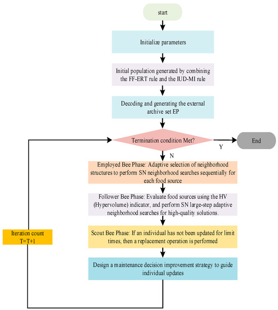 After generating the initial population, decoding and generating the EP set (External Archive set, used for storing non-dominated solutions) are required. The algorithm checks if the termination condition (program runtime) is met. If the termination condition is met, the algorithm ends. If not, the algorithm proceeds to the employed bee, follower bee, and scout bee phases. Then, a maintenance decision improvement strategy is designed to guide the update of individual solutions, followed by an update of an iteration. At this point, it checks again if the termination condition is met for the next step.