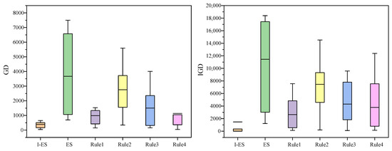 This study evaluates the effectiveness of the I-ES scheduling approach and ES algorithms, along with four scheduling rules, by using the performance metrics GD and IGD. The GD measures how close the solution set is to the true Pareto front, while the IGD assesses the extent to which the solution set covers the true Pareto front. The calculation results for the different algorithms are presented in Figure 2 and Table 2.