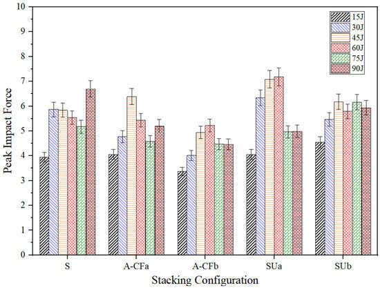 Additionally, for all impact energies, Figure 1 compares the peak impact force of five different bio-HFRP composite laminates. The comparison shows that, at the impact energy of 15 J, the symmetric configuration SUb with a carbon-to-flax ratio of 1.14 showed the highest peak impact force as compared to other stacking sequences. However, the other symmetric configuration SUa with a carbon-to-flax ratio of four performed better than the other stacking configurations in terms of peak impact force for impact energies of 30 J, 45 J, and 60 J. For the impact energies of 75 J, SUb exhibited better impact resistance as compared to the other stacking sequences. Furthermore, for the impact energy of 90 J, the sandwich stacking sequence S showed a better impact performance. This indicates that the homogeneous distribution of natural flax layers raises the material’s ability to endure deformation resulting from impact events by increasing the peak force. However, for all impact energies, the asymmetric stacking sequence A-CFb displayed the lowest peak force. This suggests that the LVI performance in terms of the composite laminates in terms of impact strength is greatly reduced when three consecutive natural flax layers are present in the tensile region of the laminates.