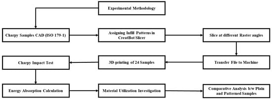 This research focused on two key objectives. First, a 3D model of the specimen was created according to the ISO 179 standard (https://www.iso.org/standard/84393.html, accessed on 23 September 2024) using commercial software, specifically Solid-Works (https://www.solidworks.com/, accessed on 23 September 2024). This model was then fabricated using a CreatBot F430 3D printer (Zhengzhou, Henan, China) with two different infill patterns: honeycomb and Hilbert curve. Polylactic acid (PLA) Plus was used as the 3D printing material to investigate its impact properties. Additionally, various raster angles were employed during the 3D printing process. The specimens were subjected to impact testing to examine the effects of different raster angles and infill patterns on mechanical properties such as energy absorption and failure modes. The impact tests were conducted using a Shimadzu Charpy impact testing machine (Shimadzu, Kyoto, Japan), and subsequent calculations were performed to determine the impact energy. The test plan consisted of additively manufacturing three samples for each infill pattern at three different raster angles and comparing them with the corresponding samples with 100% infill to justify the high energy absorption and material utilization. The detailed methodology of the study is illustrated in Figure 1.