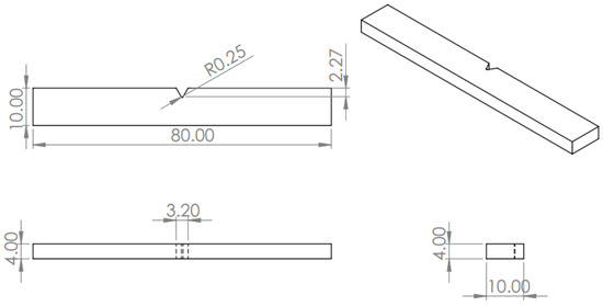 The 3D model of the impact specimen was designed following the ISO 179 standard (Figure 2) using SolidWorks. Twenty-four specimens were selected based on combinations of infill density and pattern were fabricated using a CreatBot F430 3D-printer. The infill density was kept at 40% while the Hilbert curve and honeycomb infill pattern were applied as illustrated in Figure 3a. The top layer of the Hilbert sample was also printed using the Hilbert curve pattern, as the slicing method supports this infill pattern for the topmost layer as shown in Figure 3b. In contrast, the honeycomb pattern could not be used for the top layer because it only works up to 70% infill density, while the top layer of any manufactured part requires 100% infill. Therefore, the rectilinear pattern was chosen as a top layer to cover the honeycomb infill pattern as shown in Figure 3c,d. Moreover, the specimens were printed at three different raster angles, i.e., 0°, 45°, and 90°. The specimens were additively manufactured according to the process parameters presented in Table 1.
