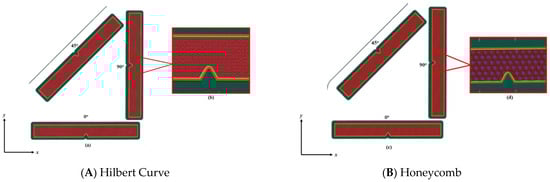 (A) Hilbert curve pattern (a) and top layer (b). (B) Honeycomb infill (c) with rectilinear top layer (d) covering.