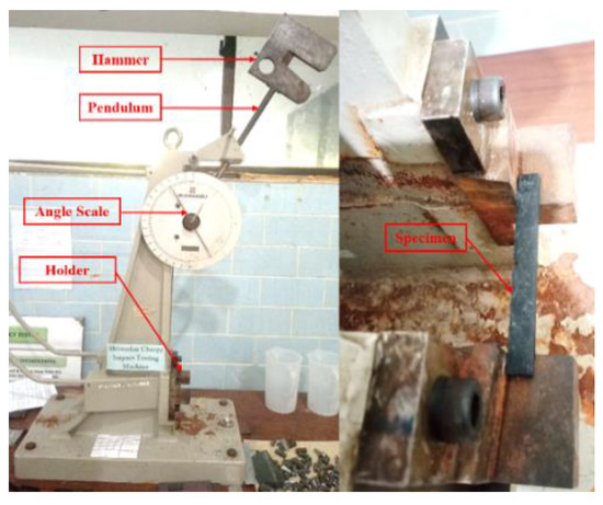 After printing the impact testing samples according to the ISO-179-1 standard (https://www.iso.org/standard/84393.html, accessed on 23 September 2024), we tested them using a Shimadzu Charpy impact machine to determine the impact strength of the samples. The machine operated with a free fall angle of 151°, i.e., “α” (the angle after the drop is “β“), a hammer weight of 22.023 N, and a moment arm of 0.363 m. The cross-sectional area of the specimens at the notch was 2.99 × 10−5 m2. The schematic of the impact testing machine is illustrated in Figure 4.