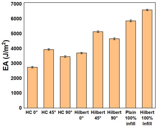 The results at 100% infill were compared with those of the plain sample along with an error analysis with respect to standard deviation as shown in Figure 6. The bar graph depicts the energy absorption (EA) values for various configurations, with error bars representing the standard deviation. The configurations (Honeycomb) HC 0°, HC 45°, and HC 90° show relatively low standard deviations, indicating consistent measurements across samples. In contrast, the Plain 100% infill configuration exhibits a higher standard deviation, suggesting greater variability in energy absorption. Overall, the error bars demonstrate the reliability and consistency of the energy absorption measurements for each configuration.