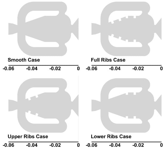 The oscillation frequency of the jet exiting the oscillator is an important flow and thermal performance factor. As evident from Figure 4a, the introduction of ribs enhances the oscillation frequency from 355 Hz (smooth case) to 820 Hz (full ribs case). In the case of ribs installed over the Coanda surface, the full ribs case has the highest frequency of 820 Hz, and the upper ribs case has the lowest frequency of 780 Hz. When ribs are installed only on the upper part of the Coanda surface, a separation bubble with a large size as compared to full ribs and lower ribs case, is formed in the mixing chamber, as shown in Figure 4b. The size of the separation bubble formed in the mixing chamber influences the frequency because it affects the jet’s switching from one side to the other. A larger separation bubble provides more resistance to the jet’s flipping, which lowers the oscillation frequency. On the other hand, the small size bubble allows the jet to flip faster and results in higher oscillation frequency.