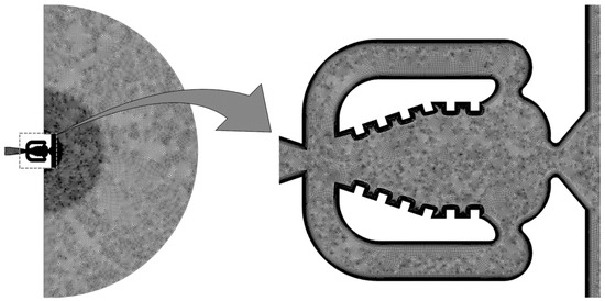 To verify the domain discretization, a mesh sensitivity analysis was conducted. Three different meshes were created as shown in Figure 2, using the exit nozzle throat diameter as a key parameter. For this study, the fluidic oscillator’s exit nozzle throat diameter (6.35 mm) was considered critical while generating the 2D mesh. Near the fluidic oscillator’s wall, the boundary layer is modeled with 20 normal to the wall layers. These layers have a growth rate of 1.1, and the first layer is 0.0127 mm thick (D/500).