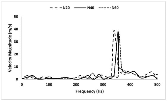 FFT analysis results as are shown in Figure 3 indicated that the frequencies for N20, N40, and N60 meshes were 340, 355, and 358 Hz, respectively. The frequency results became consistent for the normal and fine meshes, showing only a 0.84% variation. Therefore, the N40 mesh was chosen for further analysis based on these frequency results.