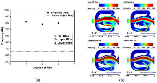 (a) Oscillation frequency and (b) velocity contours for different locations of ribs.
