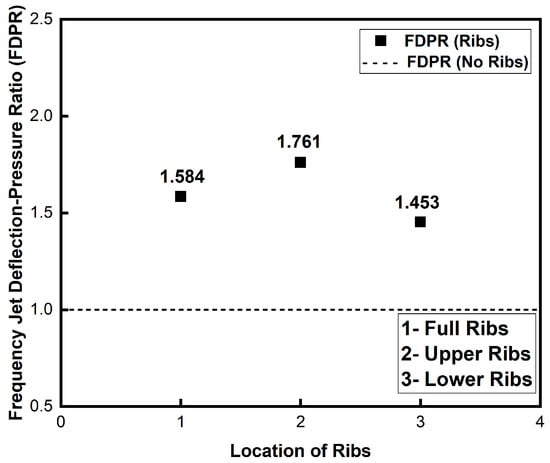 Frequency jet deflection–pressure ratio (FDPR) for different locations of ribs.