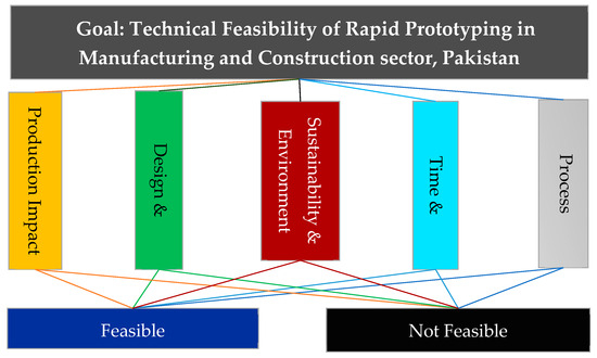 In recent times, there has been a rising trend of using rapid prototyping, especially additive manufacturing, in the construction and manufacturing sectors [1,2,3]. This process involves the layer-by-layer erection of different digital libraries and presents a transformed industry that promises to rationalize the evolution from 3D models to final products. In the context of Pakistan, rapid prototyping could play a very important role in the rapid development of industries and infrastructure. Pakistan’s construction firms can leverage this technology to construct sophisticated structures, customize material within components, and automate construction using advanced methods [4,5,6]. Simultaneously, in manufacturing, rapid prototyping can be facilitated quickly, expediting the product design, increasing product efficacy, and minimizing lead time during the initial phase of prototyping [7,8,9]. This study is based on the convergence of civil and industrial engineering perspectives and aims to conduct a technical feasibility analysis of utilizing rapid prototyping in Pakistan. The analytic hierarchy process (AHP) is used. This not only offers an opportunity to improve decision-making efficiency and effectiveness but also lays the stage for potential collaboration among disciplines. The assessment principles will highlight some key factors, such as cost savings at initial phases, design impacts, and sustainability considerations. The use of rapid prototyping not only increases efficiency in these sectors, but it will provide an opportunity to implement sustainable goals. Rapid prototyping can contribute to sustainable development goals by minimizing material waste, reducing energy consumption, and enabling the use of environmentally friendly materials [10]. The growth of 3D printer production in Pakistan can greatly contribute to the development of green industries, such as recycling and repurposing plastic and aluminum waste into materials for 3D printing. These materials can be used to create various items like furniture and building materials. This advancement supports sustainable initiatives and aligns with the Sustainable Development Goals (SDGs) while promoting Industry 4.0, which integrates modern manufacturing with digital technology [11]. The global 3D printing market, valued at USD 23.7 billion in 2023, is projected to reach approximately USD 149.4 billion by 2030, with a compound annual growth rate of 20.5% from 2023 to 2030 [12].
