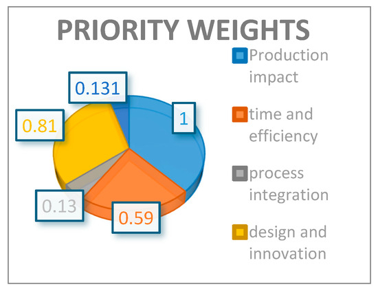 The AHP involves a deep analysis of factors and their components, which serve as the foundation for prioritizing choices. This process involves amalgamating collective stakeholders’ points of view and combining individual preferences with the perceived importance of different elements within the decision-making process. Figure 3 visually represents the weights allotted to each criterion concerning the overarching goals, derived from an inclusive evaluation of stakeholder verdicts. Likewise, we performed pairwise comparisons, using a nine-point scale to converse preferences to assess each criterion against each other. These comparisons produced a matrix indicating the relative significance of each value. To guarantee reliability, a consistent check was employed, and the eigenvector technique was used to calculate normalized weights. The priority weights assigned to different criteria are as follows. The priority weight of production impact was 1, time and efficiency was 0.59, process integration was 0.13, design and innovation was 0.81, and sustainability and environment was 0.131. Normalization is critical to maintain a consistent sum of weight equal to 1. The calculated weights were subjected to validation and census building among different stakeholders for adjustments. The ultimate weights provide a quantitative basis for decision making, illustrating the significance of each criterion in achieving overarching goals. This approach combines stakeholder preferences, ensuring transparency and consistency throughout the AHP.