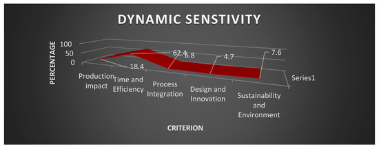 Dynamic sensitivity analysis, an integral component of the AHP, serves as an advanced method for evaluating the impact of uncertainties on decision-making rankings. It addresses variations steaming from both data and preference uncertainties. The graphical representation in Figure 5 illustrates dynamic sensitivity values, providing a clear insight into how criteria respond to potential changes in input parameters. Time and efficiency are on top with a dynamic sensitivity of 62.4, highlighting its heightened vulnerability to alterations and its crucial role in shaping overall decisions. Examined closely, production impact has a dynamic sensitivity of 18.4, indicating a moderate level of responsiveness to variation. On the contrary, sustainability and environment has the lowest dynamic sensitivity of 7.6, suggesting a relatively lower impact when compared to time and efficiency and production impact. These intricate dynamic sensitivity insights equip decision-makers with a detailed understanding of criteria responsiveness, facilitating a more adaptive and informed approach to navigating uncertainties within the decision-making landscape.