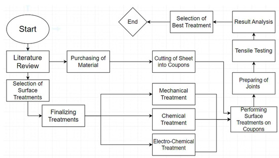 The overall methodology of the conducted experimentation is shown in Figure 1. The work started with a detailed review of the literature for careful evaluation and selection of various surface treatments and their respective parameters on aluminum alloys. The surface treatment reviewed can primarily be categorized into three major divisions, namely, mechanical, chemical, and electrochemical treatments. The procured 7075-T6 sheet was first cut into coupons of the required size using a shearing machine. These coupons were then treated with the respective surface treatments, as depicted in Figure 2. Finally, single lap joints were prepared according to the ASTM D1002 [18] standard and were tested on a universal testing machine. A comparison of results of in terms of maximum failure load and lap shear strength was performed, and best surface treatment was recommended. The details of each respective surface treatment performed within each category is given in the subsequent sections.