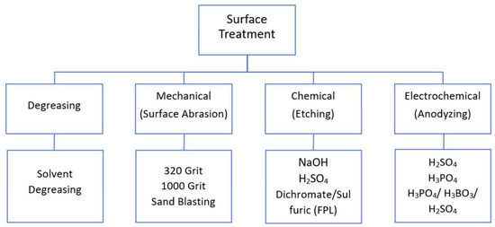 Aluminum readily forms a thin oxide layer when exposed to air. These native oxides are weak and significantly reduce bond strength if left untreated. Surface preparation aims to remove these oxides and create a clean, micro-rough surface for optimal bonding. This study investigates three primary surface treatment methods: mechanical, chemical, and electrochemical, as shown in Figure 2. The degreasing surface treatment shown in the figure will act as a control case for comparison.