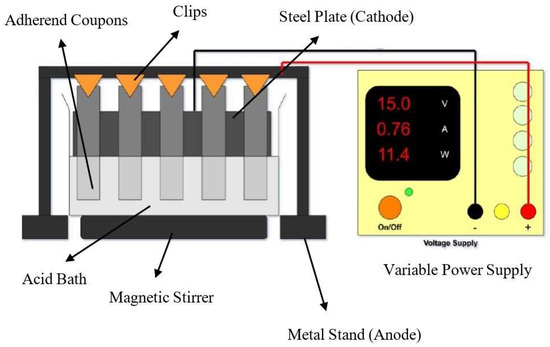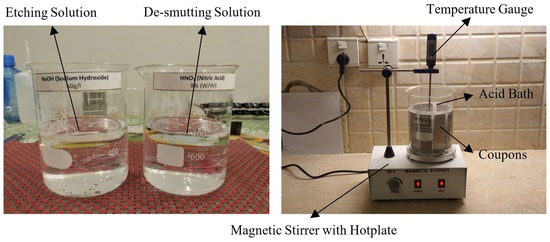Figure 3. An illustration of the etching process being performed on adherends. - Electrochemical Treatment (Anodization): This process aims to create a controlled, porous oxide layer on the aluminum surface to enhance surface roughness. Figure 4 shows a schematic of the procedure used for anodization. Similar to chemical treatment, the process began with the solvent degreasing step. This was followed by etching with a NaOH solution for 4 min at 50 °C, and a subsequent de-smutting step using an HNO3 bath for 3 min. Rinsing with distilled water was performed between each step to prevent solution contamination. Anodization was performed in an acid bath with steel as the cathode, at 15 V for 25–30 min. The bath temperature was kept between 26 and 29 °C to complete the anodization process. The coupons were then completely cleaned with distilled water until a neutral pH of 7 was attained. Specific details regarding types of anodization performed and their respective concentration, time, and temperature parameters are provided in Table 2.