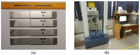 Tensile testing of the manufactured joints (Figure 6a) was conducted on a Universal Testing Machine (UTM) (Figure 6b) at a crosshead speed of 1.3 mm/min. Testing was performed at room temperature. End tabs were bonded to the SLJ extremities to provide correct alignment with the UTM axis. A minimum of four specimens were tested per surface treatment for repeatability of results.