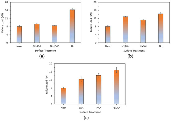 Variation in failure load trends for (a) mechanical treatments, (b) chemical treatments, and (c) electro-chemical treatments.