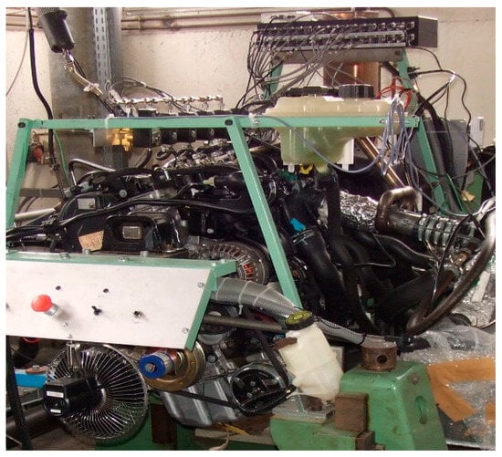 This research employed a 4-cylinder, 2 L, high-speed automobile diesel engine mounted on a test bench equipped with an eddy current type dynamometer. The studied diesel engine and associated test bench have been used in multiple studies previously [16]. The compression ratio, stroke, and bore dimensions were 18, 88 mm, and 85 mm, respectively. The rated maximum power and torque were 100 kW at 4000 rpm and 320 Nm at 1750 rpm, respectively. Port water injection was introduced into the diesel engine, allowing for variable injection rates. The experimental setup is shown in Figure 2.