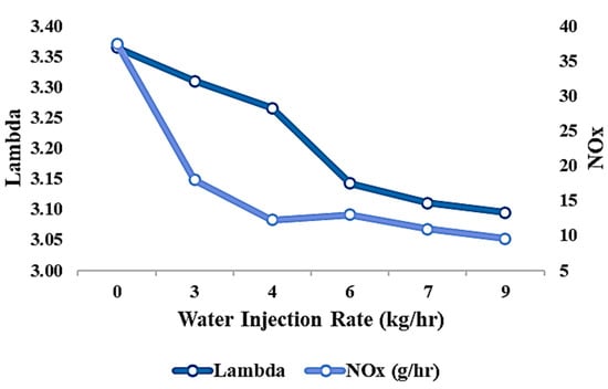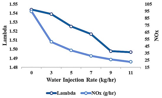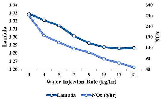 Figure 6 shows the comparative results of the lambda ratio and NOx emissions with respect to the increase in water injection rate at set 4, representing high loading conditions in terms of elevated torque. The values of the lambda ratio and NOx emissions without port water injection were measured at 1.33 and 292 g/h. The water injection rate was increased up to 21 kg/h., which showed a gradual decrease in the values of NOx emissions. The decrease in NOx emissions continued down to 47 g/h. The lambda ratio decreased meagerly to 1.29, remaining within lean combustion mode. The overall percent change in the value of lambda ratio was only 3% while a significant decrease of 84% in NOx emissions was noted.