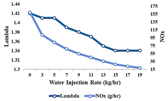 Numerous investigations consistently highlight water injection’s ability to significantly reduce NOx emissions in diverse engine types and operating conditions [12]. Available research is focused on studying the interplay between water injection, thermodynamic processes, and NOx emissions in diesel engines only. The relationship between water injection, air–fuel ratios (AFRs), and NOx emissions has not been studied yet.