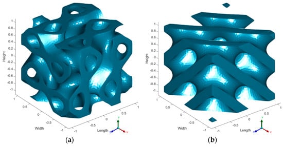 TPMS scaffolds, specifically the Diamond and SplitP structures, were designed using nTop 5.4.2 software. The scaffolds were created with three distinct porosities: 55%, 65%, and 75%, to investigate the effects of different porosity levels on the fluid flow and structural performance. The porosities of 55%, 65%, and 75% were selected as they represent a typical range for effective performance within the supported cellular structure responses, which commonly range from 50% to 90% []. The geometries were generated and optimized to achieve the desired porosity and mechanical properties. The resulting scaffold designs were then converted into a computational model with a tetrahedral unstructured mesh. CAD models for both structures are shown in Figure 1: