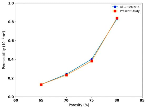 The current numerical methodology has been validated by comparing its results with those reported in the existing literature. Specifically, we compared the results of the Gyroid structure for permeability with the study by Ali and Sen [], who utilized the power law model for their analysis. Our results show good agreement with those obtained by Ali and Sen [], indicating a high level of accuracy. Figure 3 demonstrates the validation of our numerical approach for determining the permeability of the Gyroid structure.