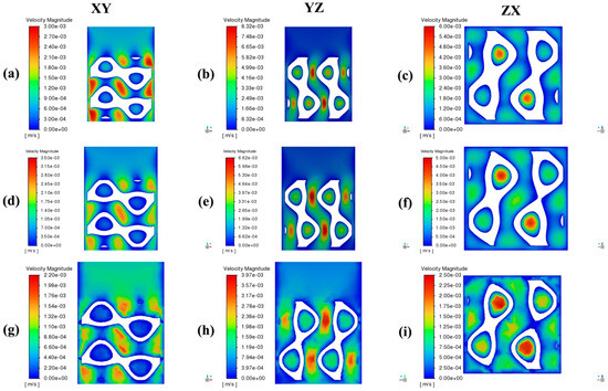 Velocity contour for the Diamond structure at (a–c) 55% porosity, (d–f) 65% porosity, and (g–i) 75% porosity.