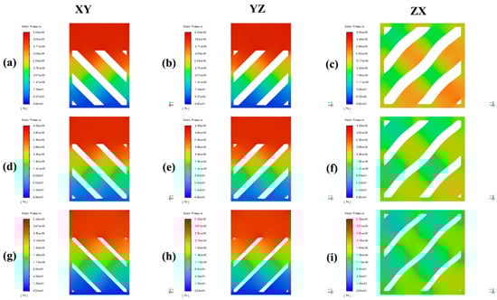 Pressure contour for the Diamond structure at (a–c) 55% porosity, (d–f) 65% porosity, and (g–i) 75% porosity.