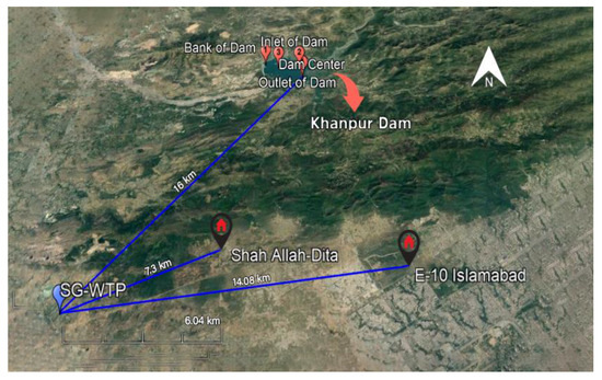 At present, the Simly Dam and the Khanpur Dam are the major sources of water supply in Islamabad [15]. The Khanpur Dam is on the Haro River, located about 50 km from Islamabad in the village of Khanpur, Khyber Pakhtunkhwa province of Pakistan. The designed storage capacity of the dam reservoir is 26,062 million gallons (MG). Currently, the total amount of water supplied annually from the dam is about 57,885 MG, of which about 17,011 MG is provided for municipal use, including drinking water, and 21,323 MG for irrigation purposes [16]. Prior to supplying Islamabad city, the water from the Khanpur Dam is treated at the Sangjani water treatment plant (SG-WTP). The Sangjani treatment plant is being operated on a conventional treatment process with a design capacity of 51 MG per day. Conventional water treatment at the Sangjani plant is done by coagulation, flocculation and sedimentation processes. The raw water coming from the Khanpur Dam is received in a well and then sent to an alum mixing tank. From the alum basin, the water goes to the coagulation chamber. After that, flocculation is carried out through the baffles by providing a zig-zag track to the water for proper mixing of the alum and accumulation of particles. Subsequently, water filtration is conducted with the help of sand filters. As the last step of the treatment process, chlorination is performed prior to water distribution [17]. Water from the Khanpur Dam is supplied to the SG-WTP through intermittent underground pipelines and open channels. The treated water from the Sangjani plant is transported to Islamabad and Rawalpindi through water supply lines and temporary storage facilities (overhead tanks) [18].
