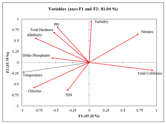 Principal component analysis (PCA) was used to simplify our data by reducing the dimensionality of the data set and preserving the variance up to the maximum possible extent. Through PCA, the original variables were transformed into principal components. Principal component analysis showed that three factors from ten parameters are affected the most. The first factor (F1) shows a maximum variance of approximately 45.26%, with the parameter’s temperature, chlorine and total coliforms showing the highest loading value (>0.8). The second factor (F2) shows a maximum variance of approximately 35.79%, with the parameters pH and turbidity showing the highest loading value (>0.8). The third factor (F3) shows a maximum variance of approximately 18.9%, with the parameter orthophosphate showing the highest loading value (>0.8).