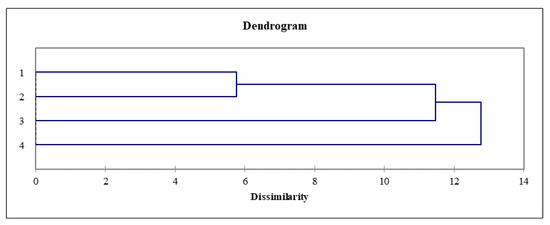 Cluster analysis of four sites under study: (1) = SG-WTP Inlet, (2) = Khanpur Dam, (3) = Consumer End, (4) = SG-WTP Outlet.