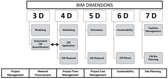 - BIM-aided CW quantification assists in the considerable reduction of waste generation in building construction projects in various countries [40,41]. A study in South Korea validated a BIM-based quantification model on two residential buildings and a sports complex. BIM implementation at the design validation stage was able to reduce waste between an observed 4.3% and 15.2% [40]. In another study conducted in Spain, the implementation of a BIM-based quantification model was able to reduce waste by 56% [41].