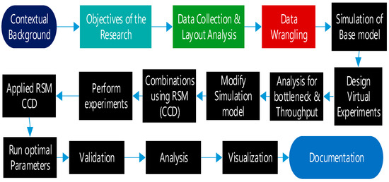 Our work design in Figure 1 began with an assessment of the current state of prosthodontic services followed by setting clear goals to make the workflow more efficient and increase throughput. To understand the system’s operation, we gathered and analyzed data over 2 weeks by physically visiting the site. We determined the distributions of each input using expert Fit after the data wrangling process and then used these distributions as input for various parameters based on the intrinsic syntax of simio. We used these data to build a base model with DES to understand the current system’s performance. Next, we examined the simulation to identify bottlenecks and measure throughput, helping us design virtual experiments to test different scenarios. For improvement purposes, we introduced additive manufacturing into the system to smoothen workflow and throughput. We used RSM and, composite design to find the best settings for our new process. We then performed experiments with these setting. After determining the best parameters, we implemented them in the prosthodontic system and checked to see if the performance improved by comparing before and after data. We analyzed the results to understand the impact on bottlenecks and throughput and created visual aids to share our findings.