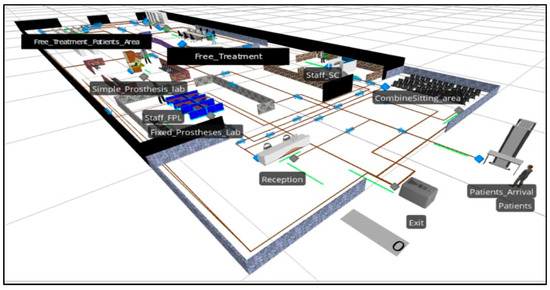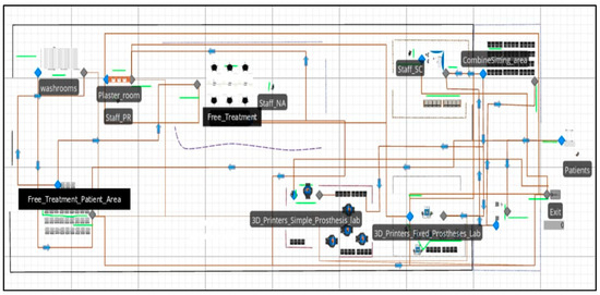 Figure 2 outlines the framework of a prosthodontic services clinic, showing the dynamic interplay between patients and staff as they flow through the facility. Patients enter the system at the entry point and progress sequentially through various service points, labelled Server 1 to 6. Each service point performs tasks manually with different capacities and parameters, and is attended to by dedicated staff members labelled Staff 1 to 6. Before proceeding, patients are provided access to sitting areas and combined sitting areas for their convenience. Washrooms are accessible as needed. The flow paths, depicted using directional arrows, shows the chronological order of their interactions within the clinic. This model serves as a representation of the clinic’s workflow and interactions, and provides the it groundwork for identifying bottlenecks and optimizing throughput.