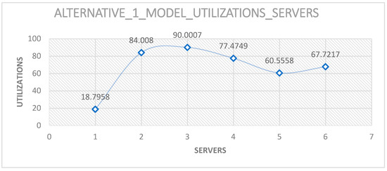 In the alternative model, Servers 2 and 4 use 3D printing, with 84.008% and 77.4749% utilization rates, respectively, while Server 3, which has extra help, exhibits a utilization rate of 90.0007% (Figure 5). The changes resulted in a high a throughput of 1.03, showing improved service quality. However, high utilization of the previous models’ bottlenecks is still observed.