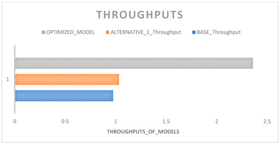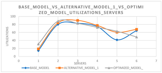 The optimized model outperformed the base and alternative models based on comparisons of throughput and server utilization. The improvement is characterized by a higher throughput of 2.3 in comparison to 0.9 for the base model and 1.03 for the alternative model. The optimized model has more balanced workload across Servers 1, 2, 3, 4, 5, and 6 with utilization rates of 31.1407%, 88.4426%, 82.7617%, 72.7216%, 62.9483%, and 48.6785%, respectively. This indicates that the optimized model is the best choice among all three models.